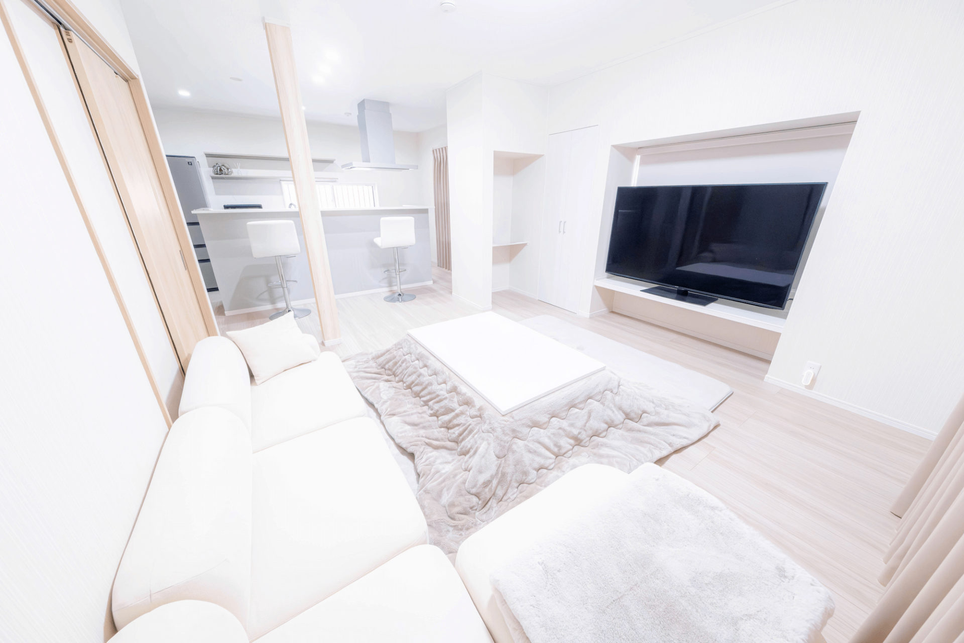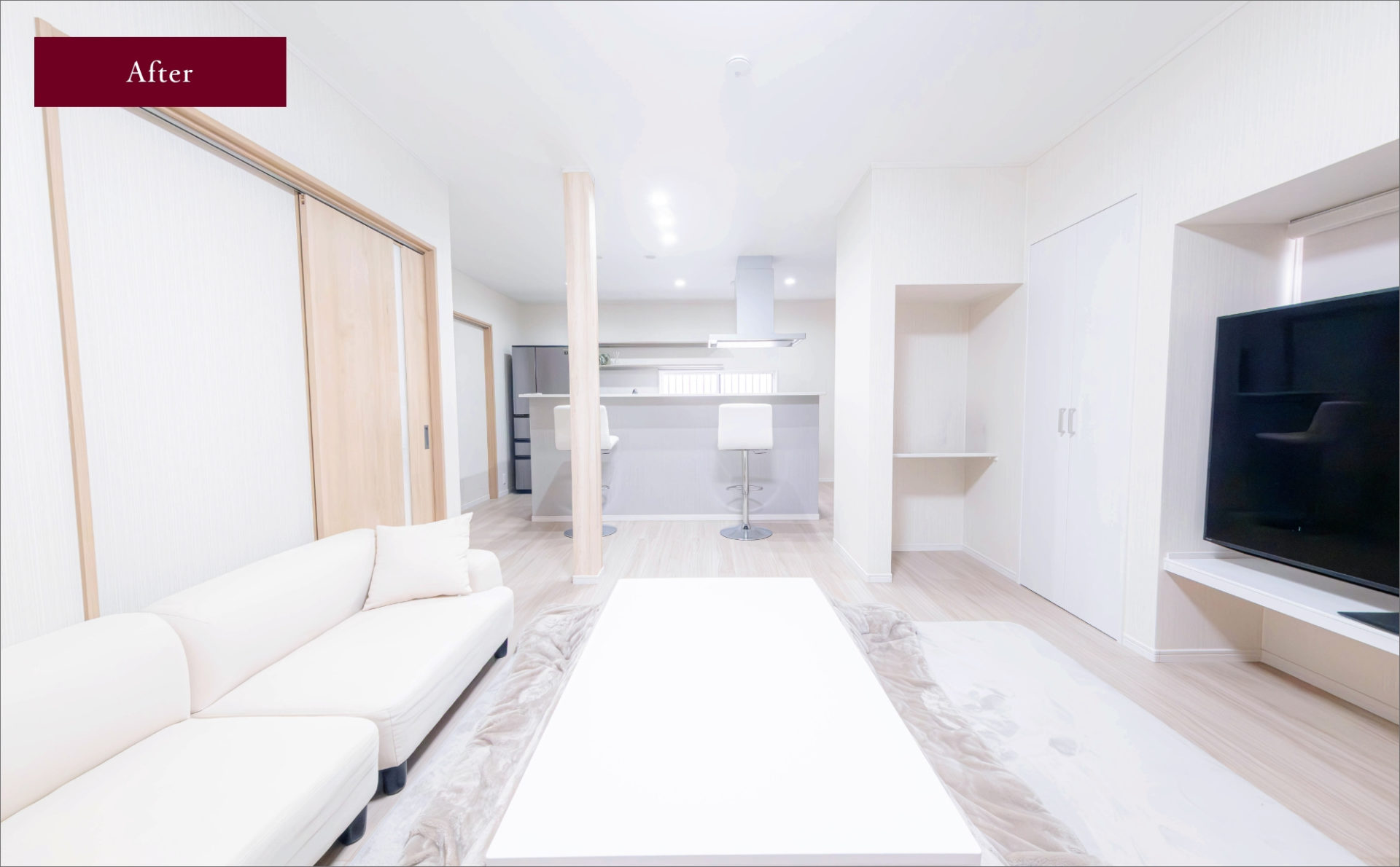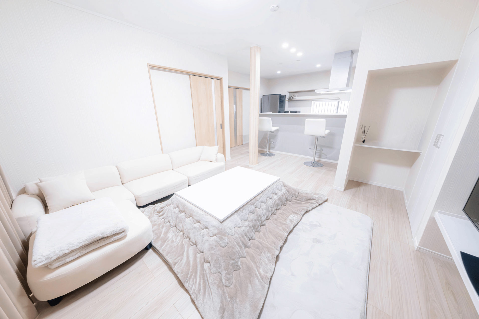 間仕切り壁の一部を撤去し、一間にしたLDKに残った既存の柱には、木目のクロスを張り、全体のグレイッシュ・ホワイトのカラーリングと合わせて空間をコーディネート。