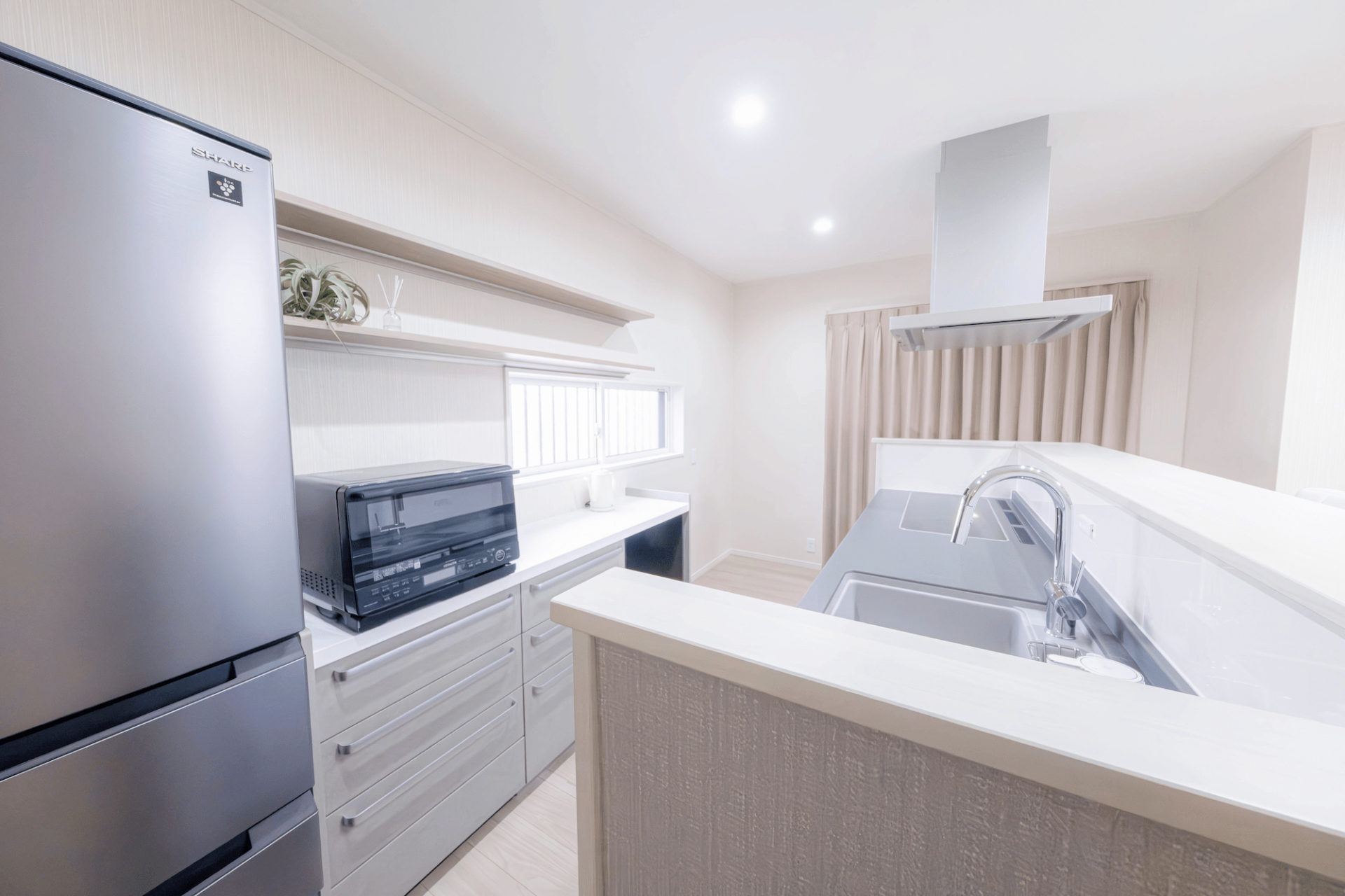 身長が高い姪っ子様が使いやすいよう、レンジフードの位置・天井の高さ調整を施したキッチンは、壁面キッチンから対面のLクラスキッチンへと生まれ変わりました。